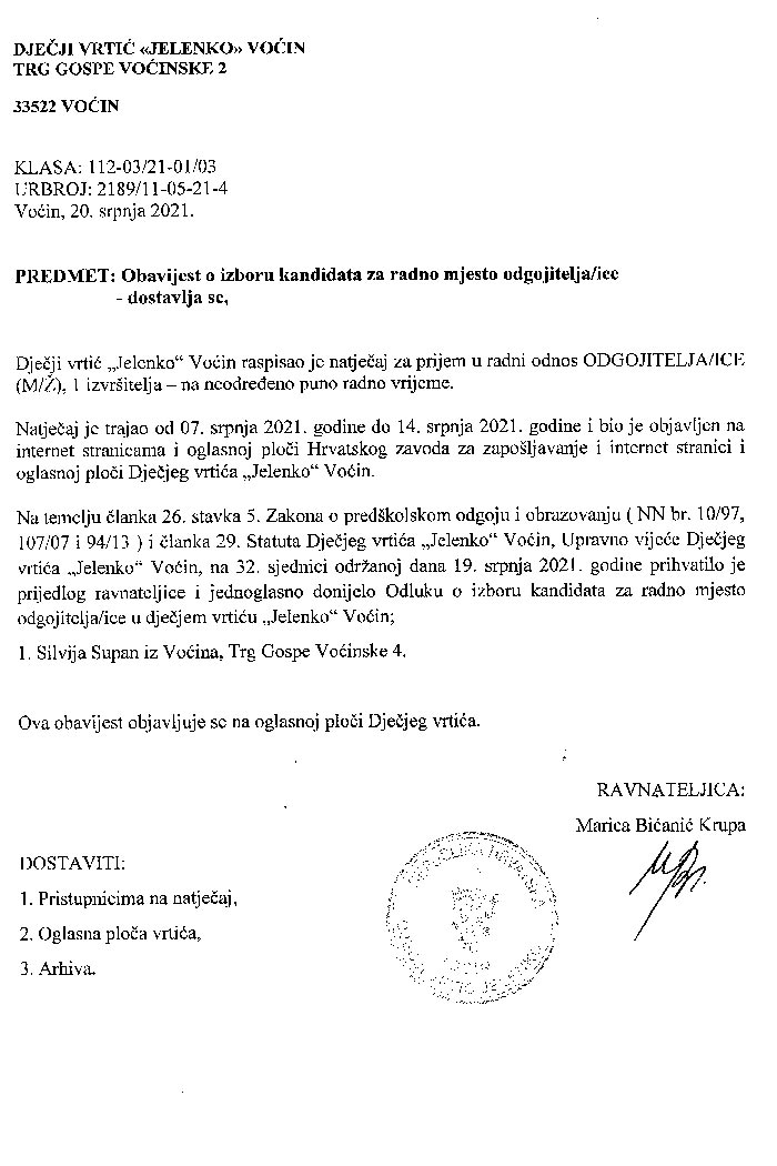 Obavijest o izboru kandidata za radno mjesto odgojitelja/ice u DV Jelenko
